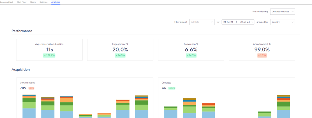 This dashboard provides information that helps you take informed decisions on the performance of the chatbot and define action items to improve them.